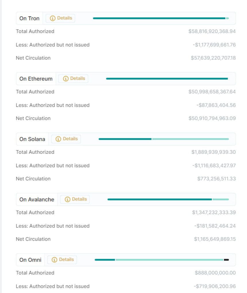 Как подчеркивает CEO Паоло Ардоино, новые монеты были выпущены для «пополнения запасов». По его словам, выпуск авторизован, но криптовалюта еще не перечислена на счета. В итоге прямо сейчас стейблкоин USDT функционирует в 15 блокчейнах — а его совокупная капитализация во всех существующих сетях превышает $111 млрд. Из них $58 млрд приходится на блокчейн Tron, $50 млрд — на Ethereum, $1,8 млрд — на Solana.